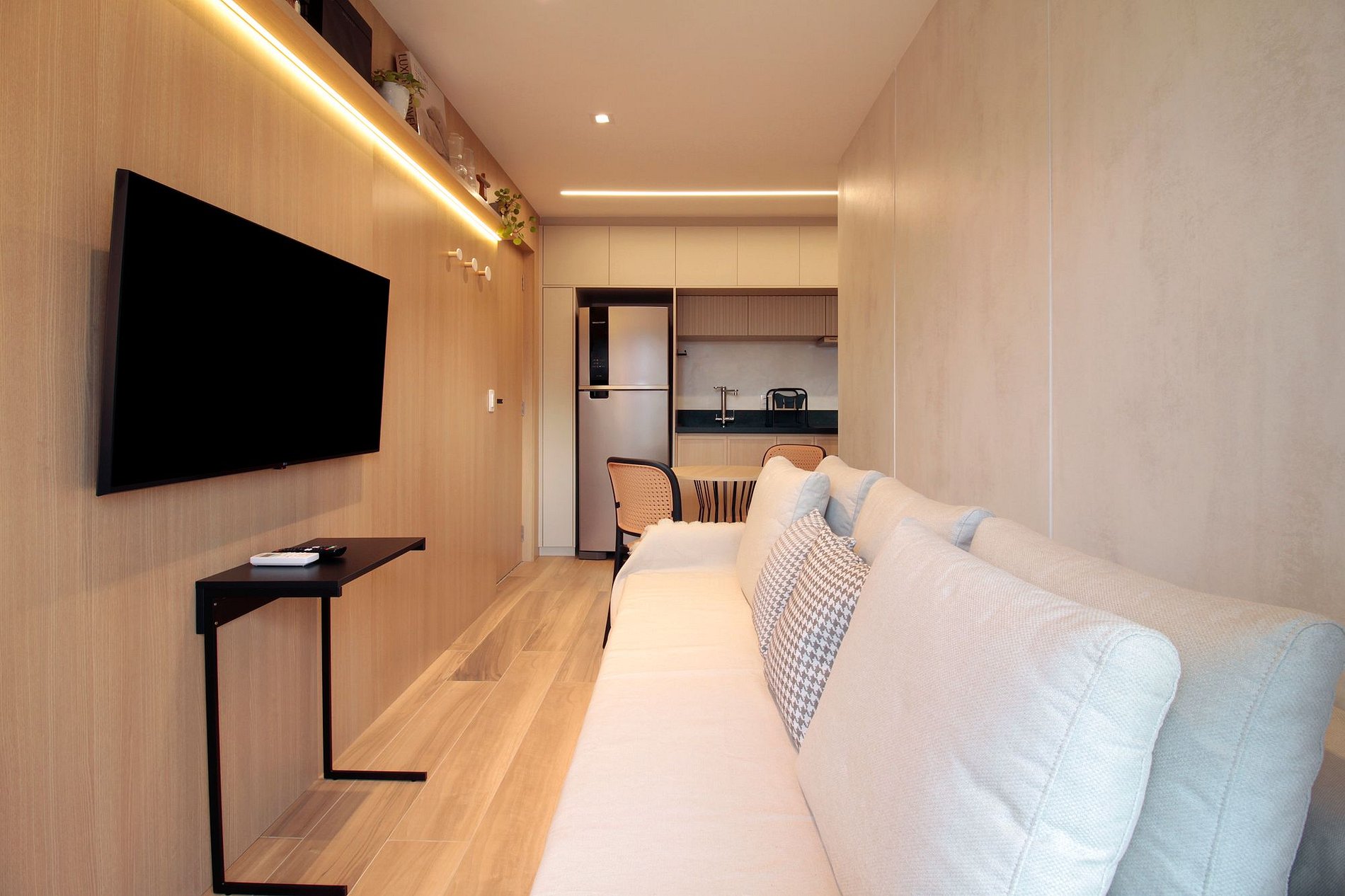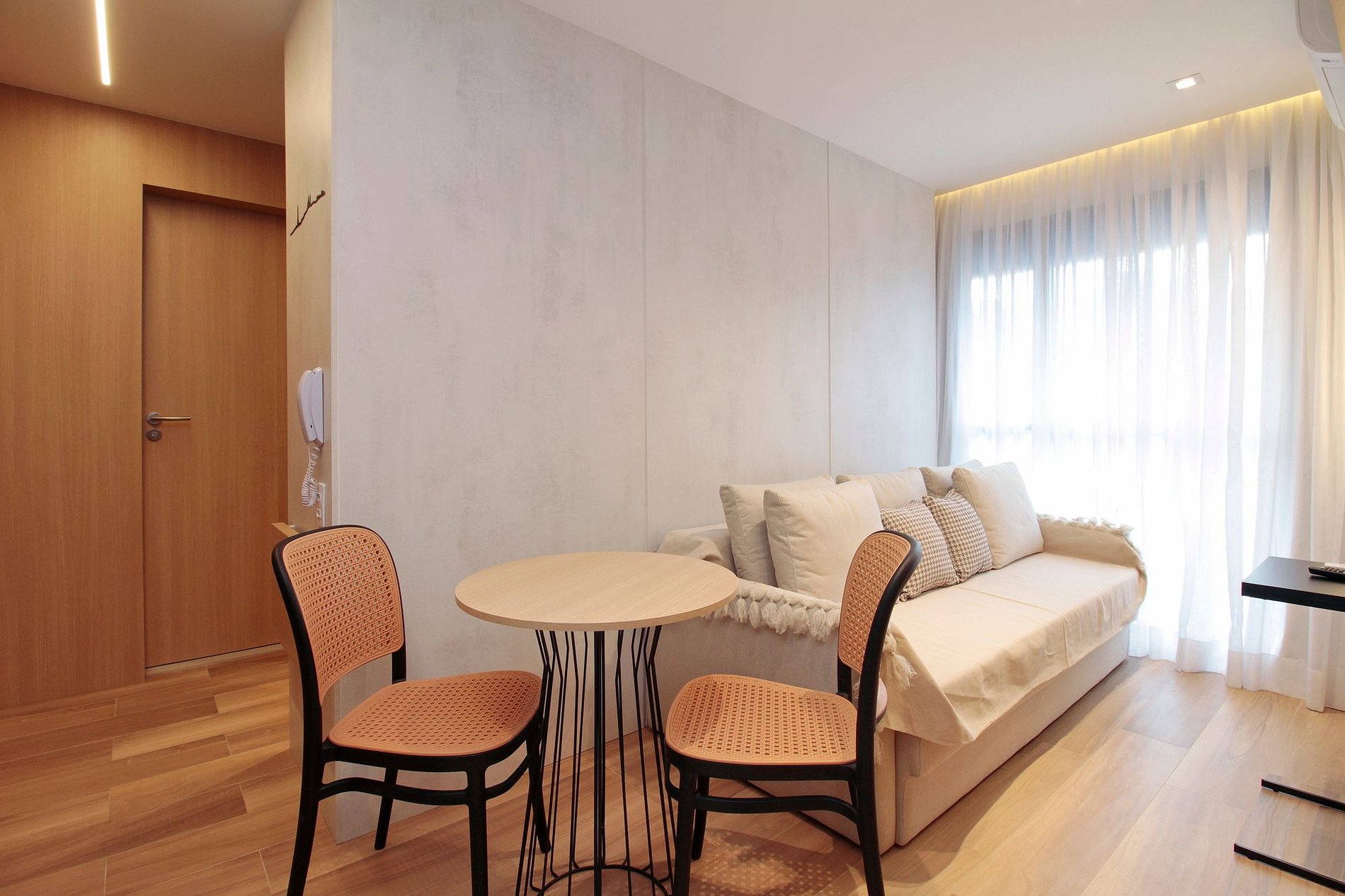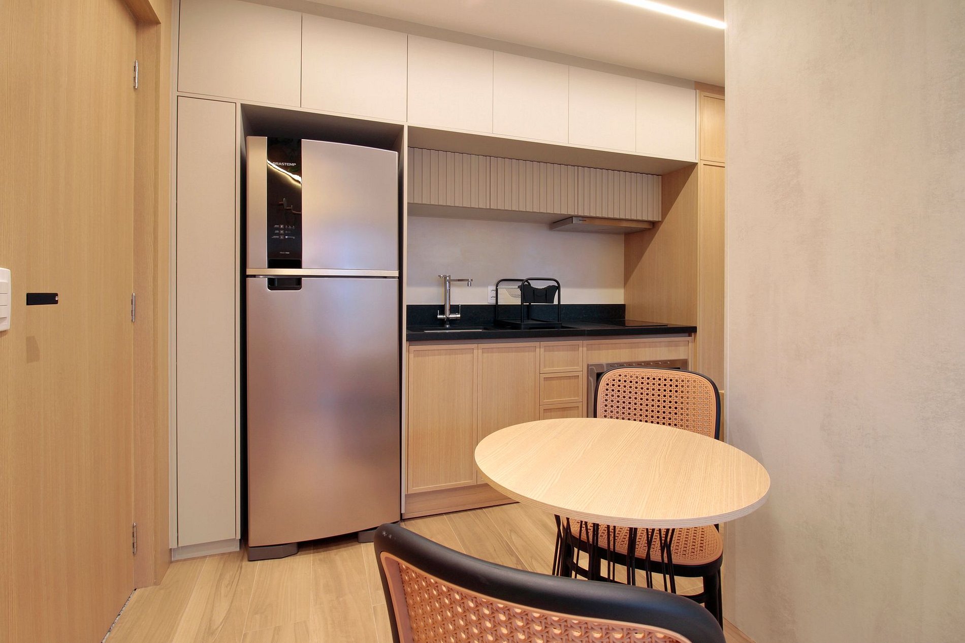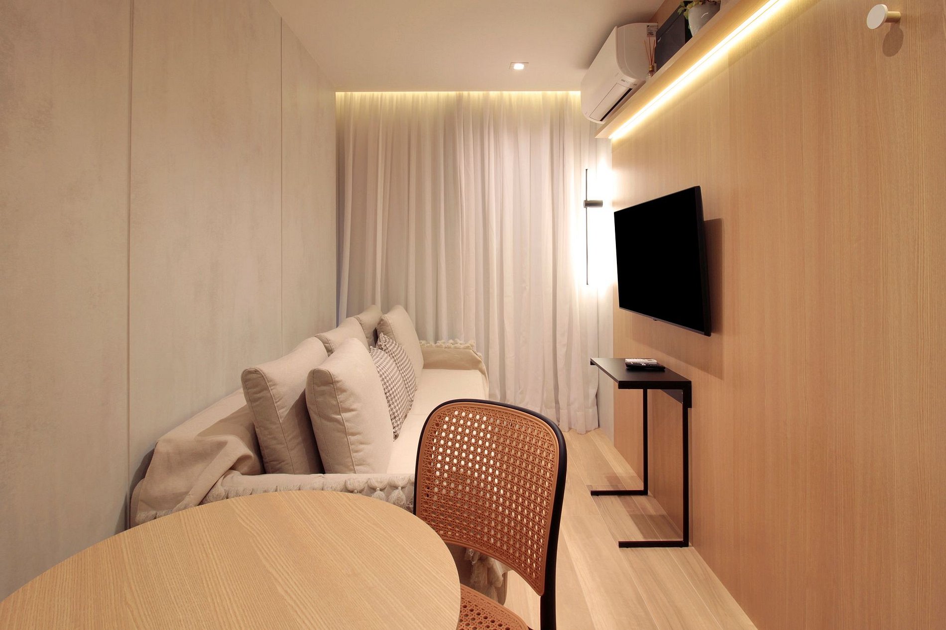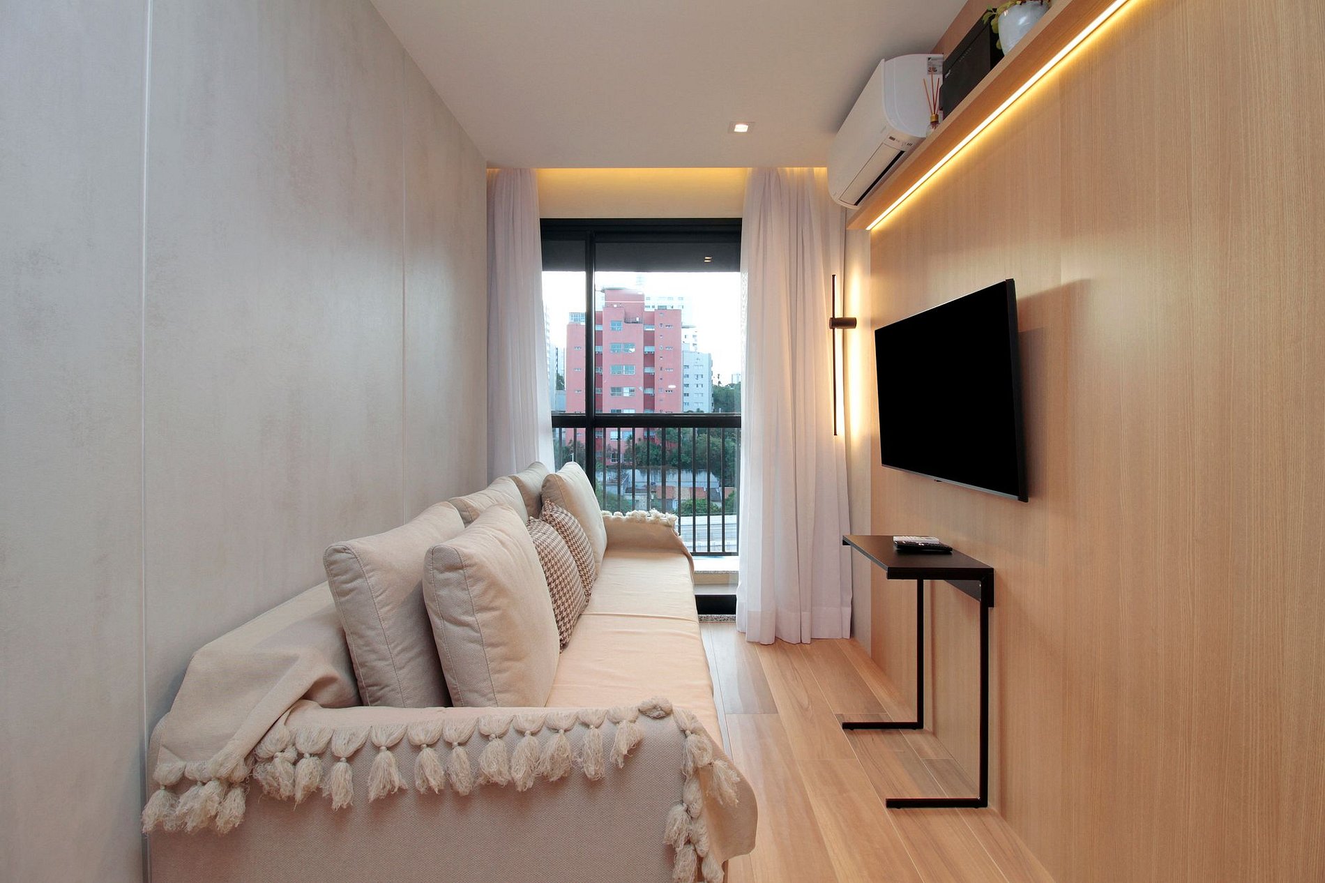 Os 35m2 são bem distribuídos entre a sala integrada com varandinha e cozinha bem completa. Nela, temos sofa confortável, cortina blackout, ar condicionado, TV Smart e excelente internet.