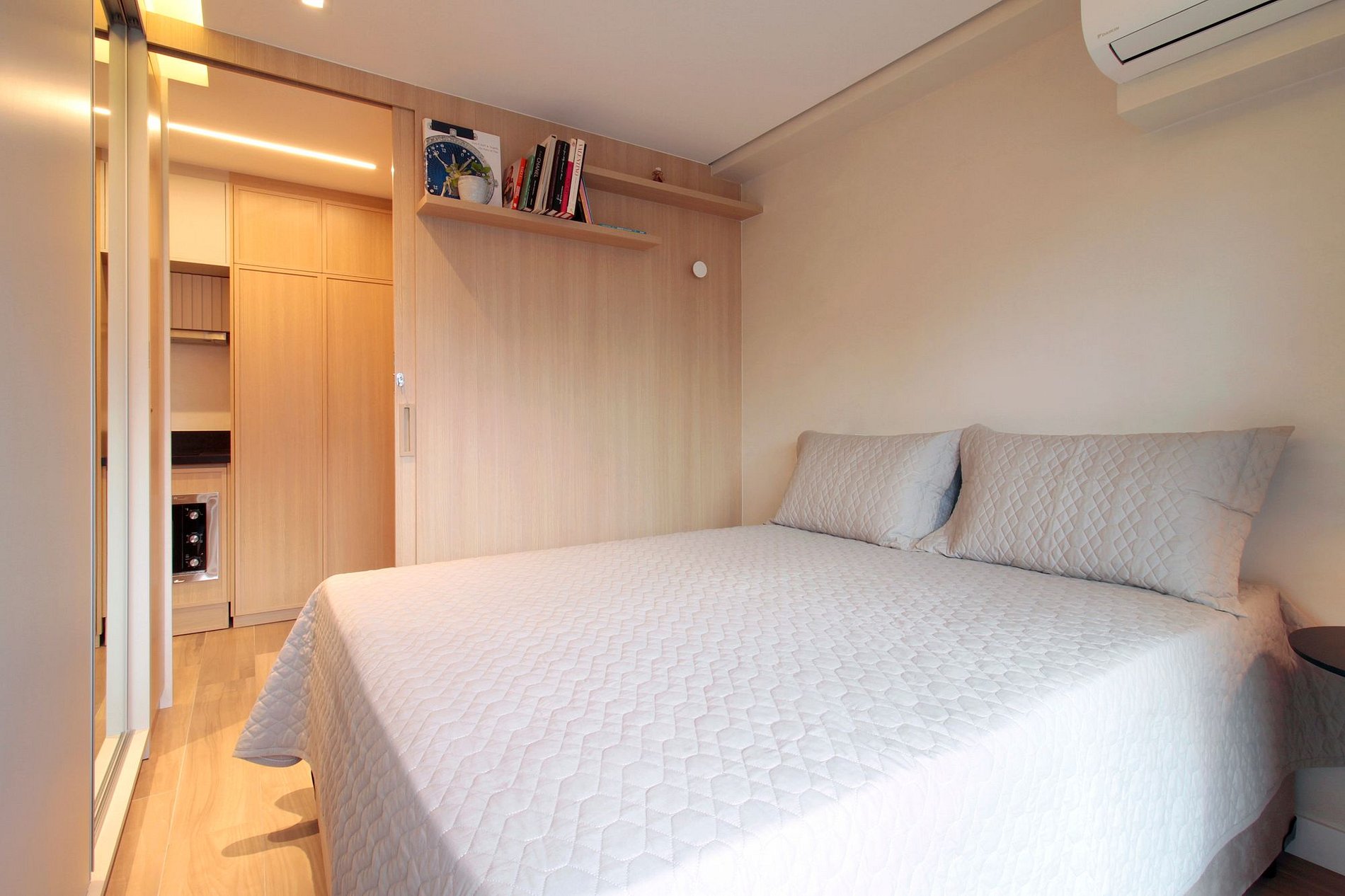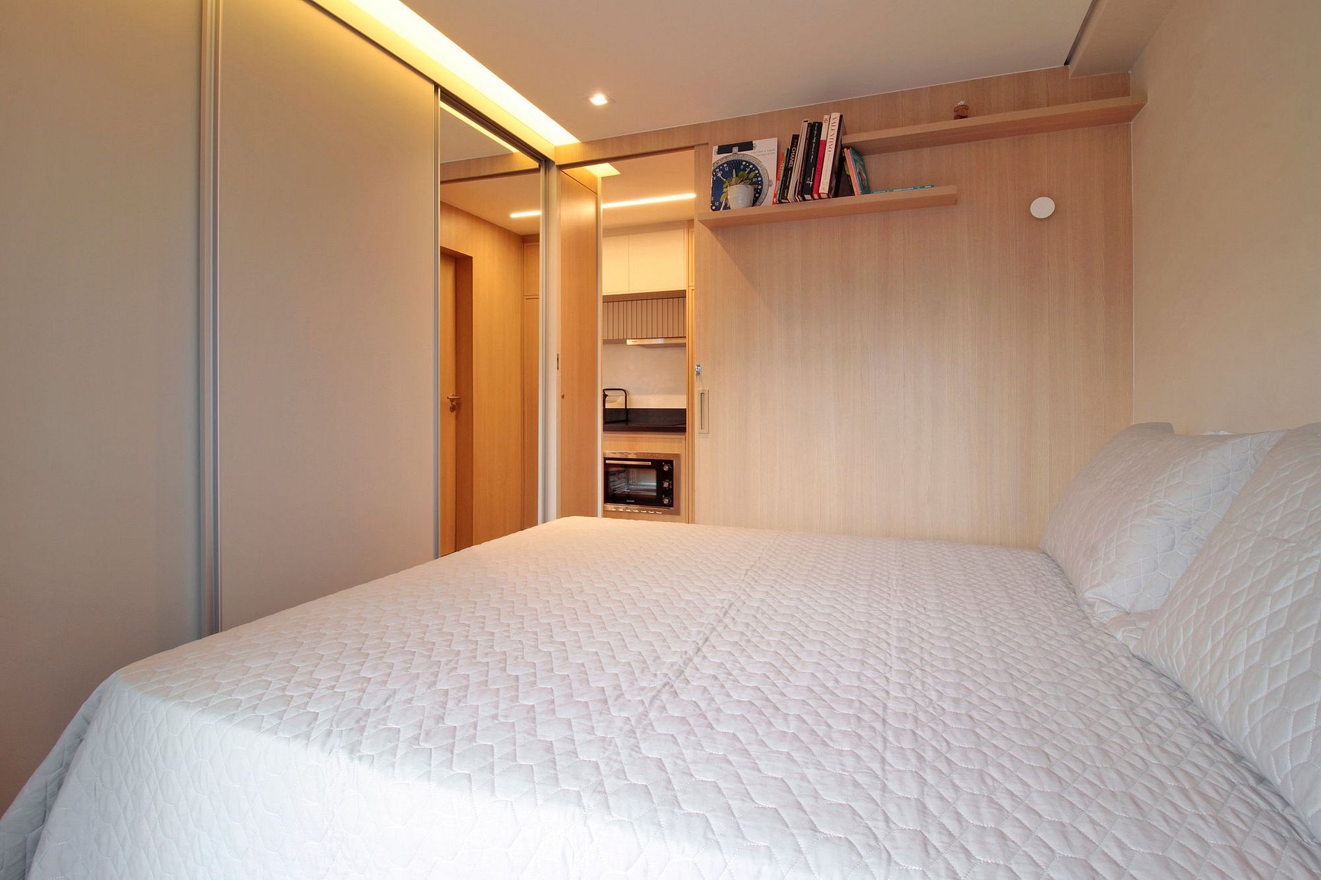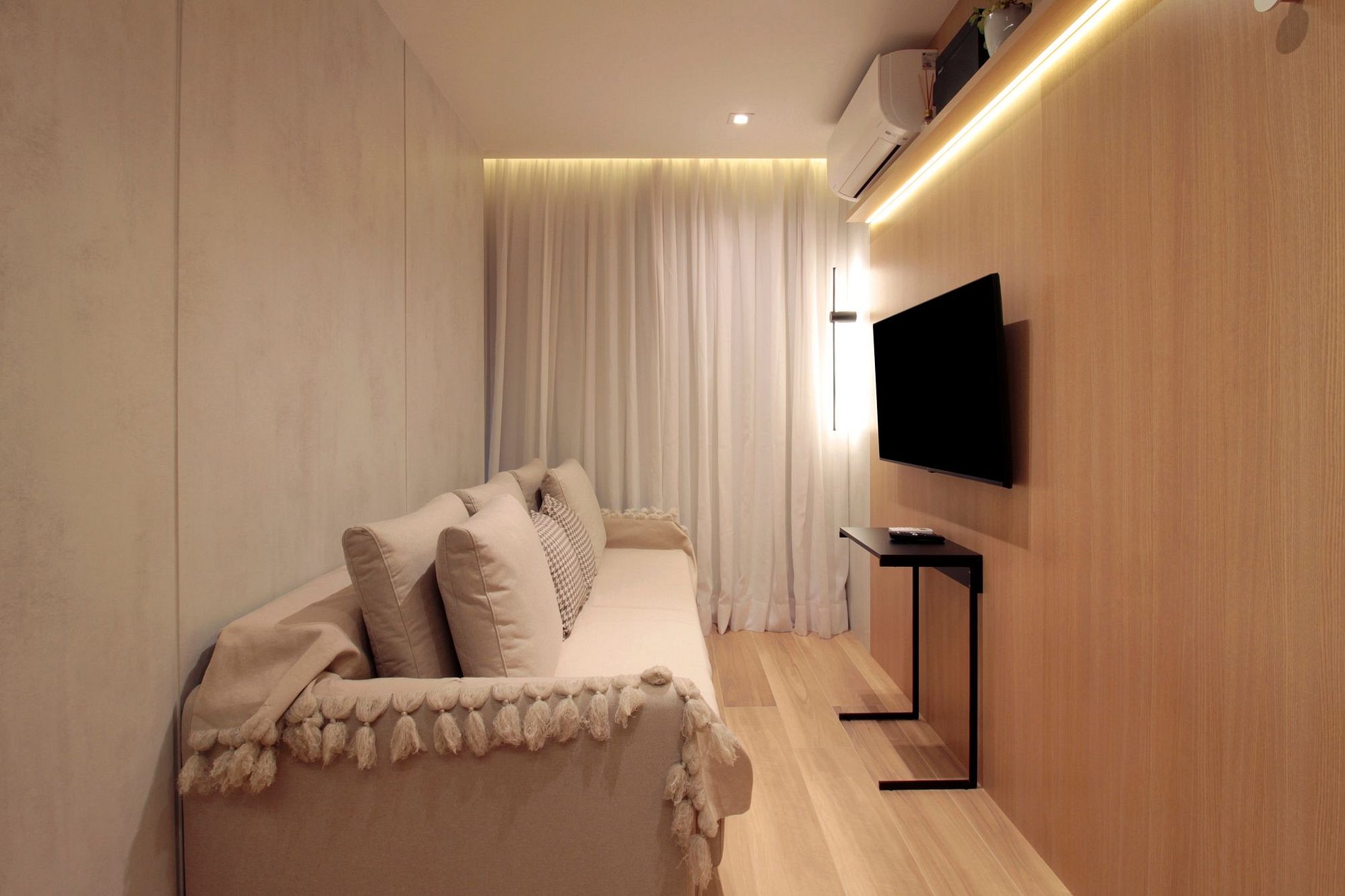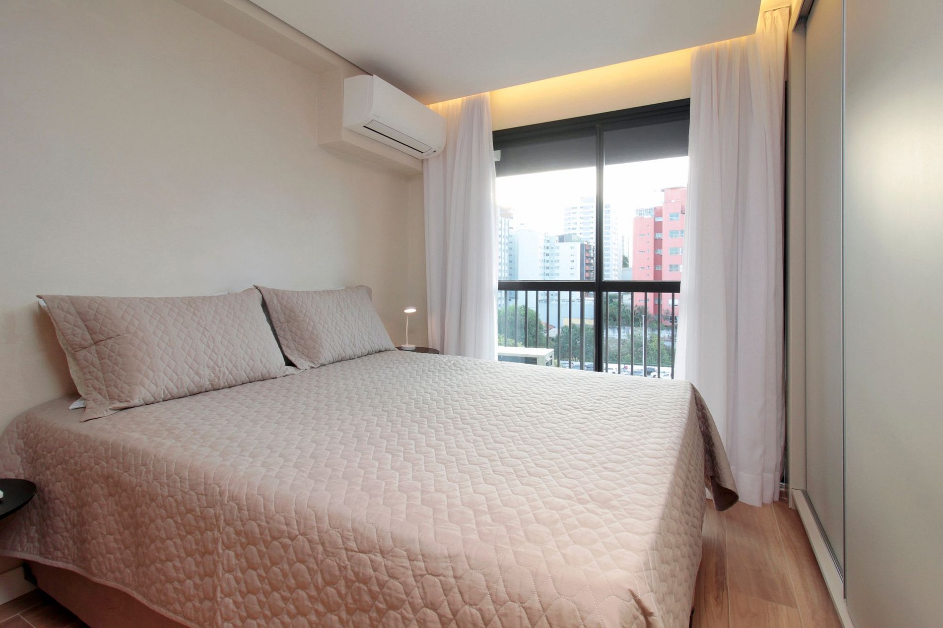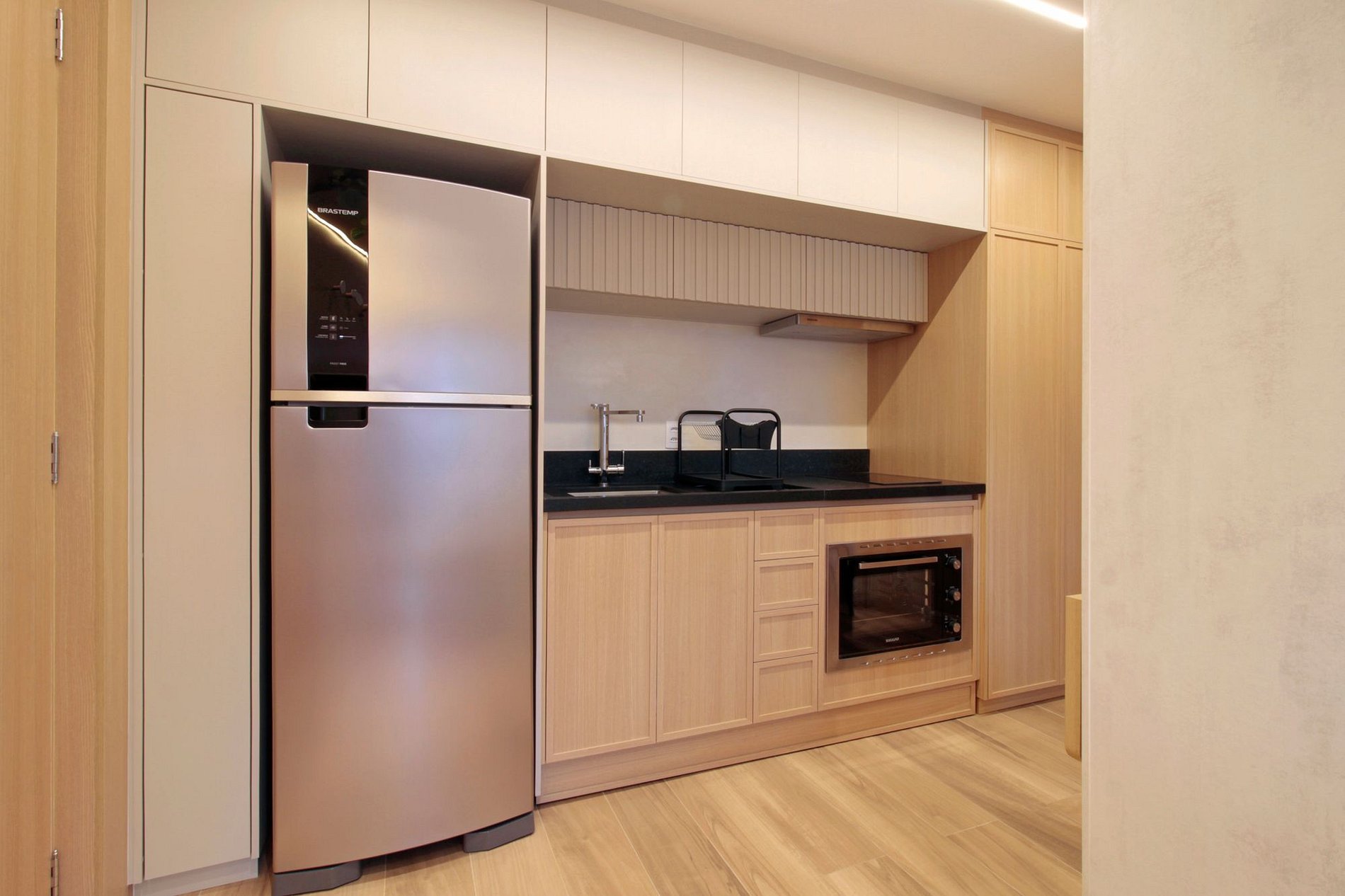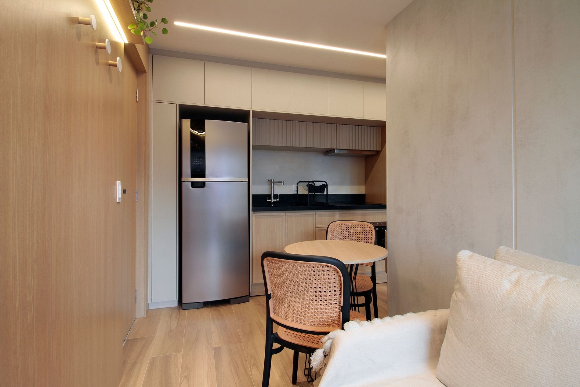 Os 35m2 são bem distribuídos entre a sala integrada com varandinha e cozinha bem completa. Nela, temos sofa confortável, cortina blackout, ar condicionado, TV Smart e excelente internet.
