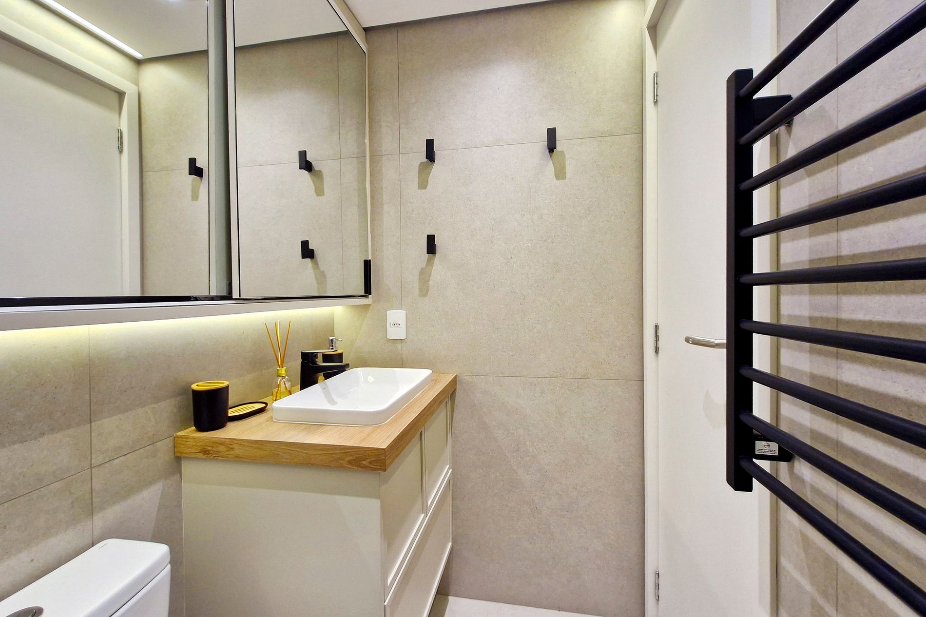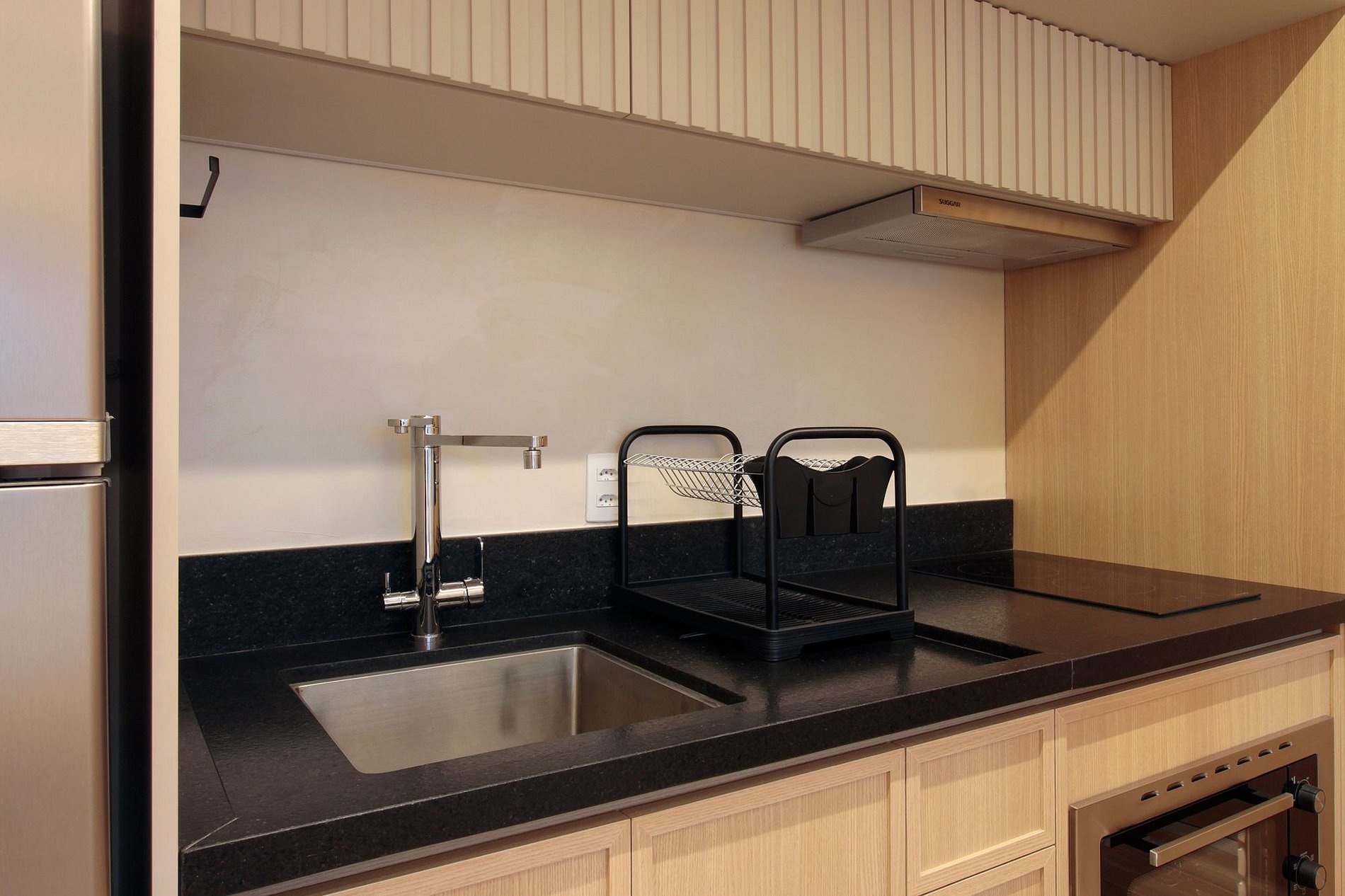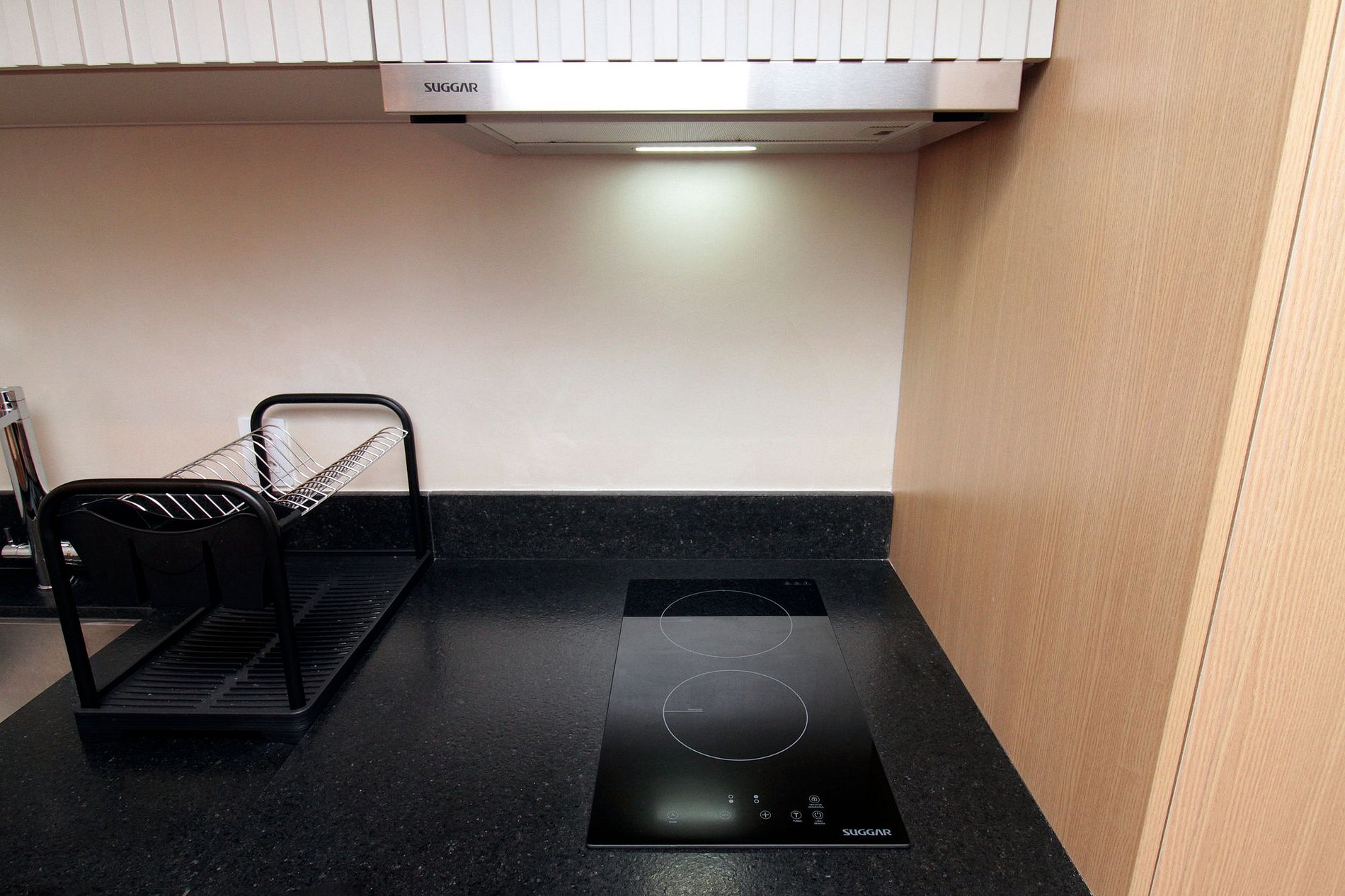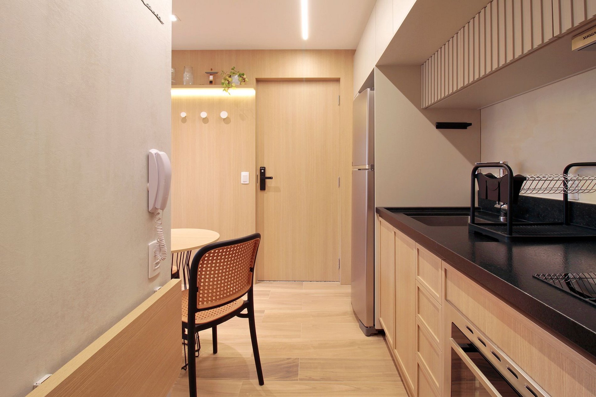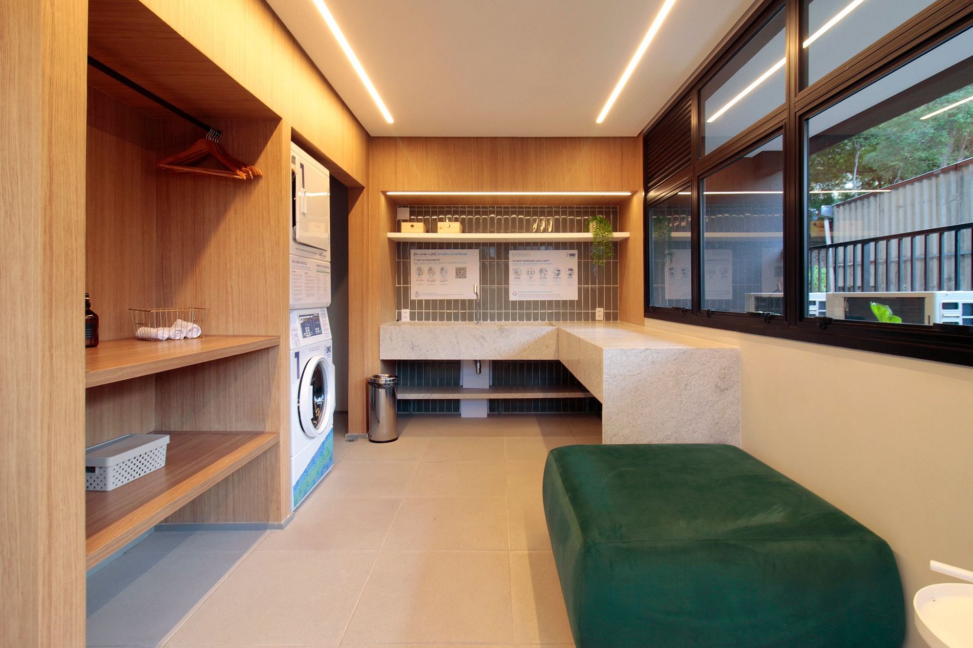 Os 35m2 são bem distribuídos entre a sala integrada com varandinha e cozinha bem completa. Nela, temos sofa confortável, cortina blackout, ar condicionado, TV Smart e excelente internet.