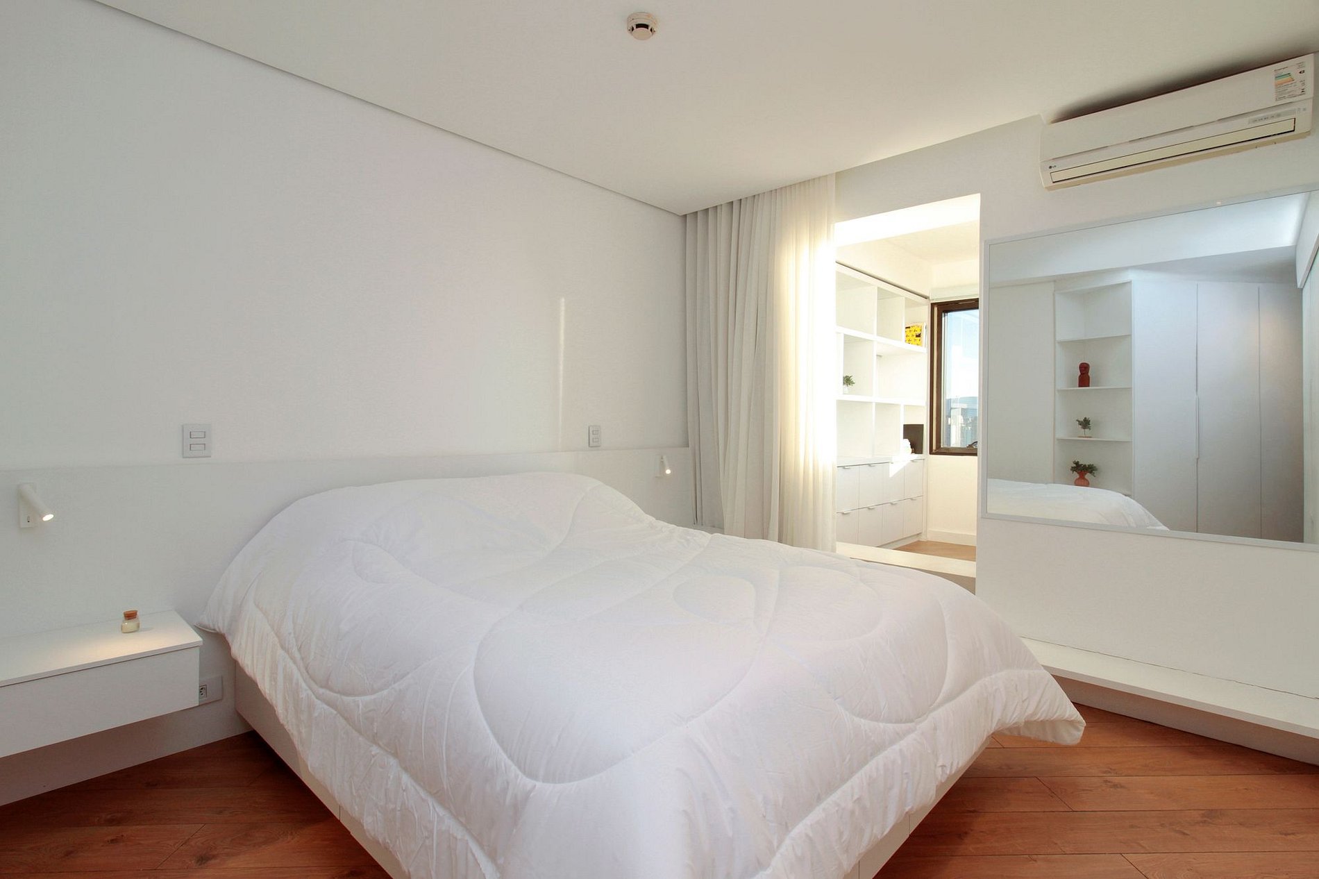 A suíte conta com cama queen, ar-condicionado, enxoval de qualidade, blackout, banheiro em mármore e espaço para home office.